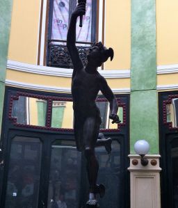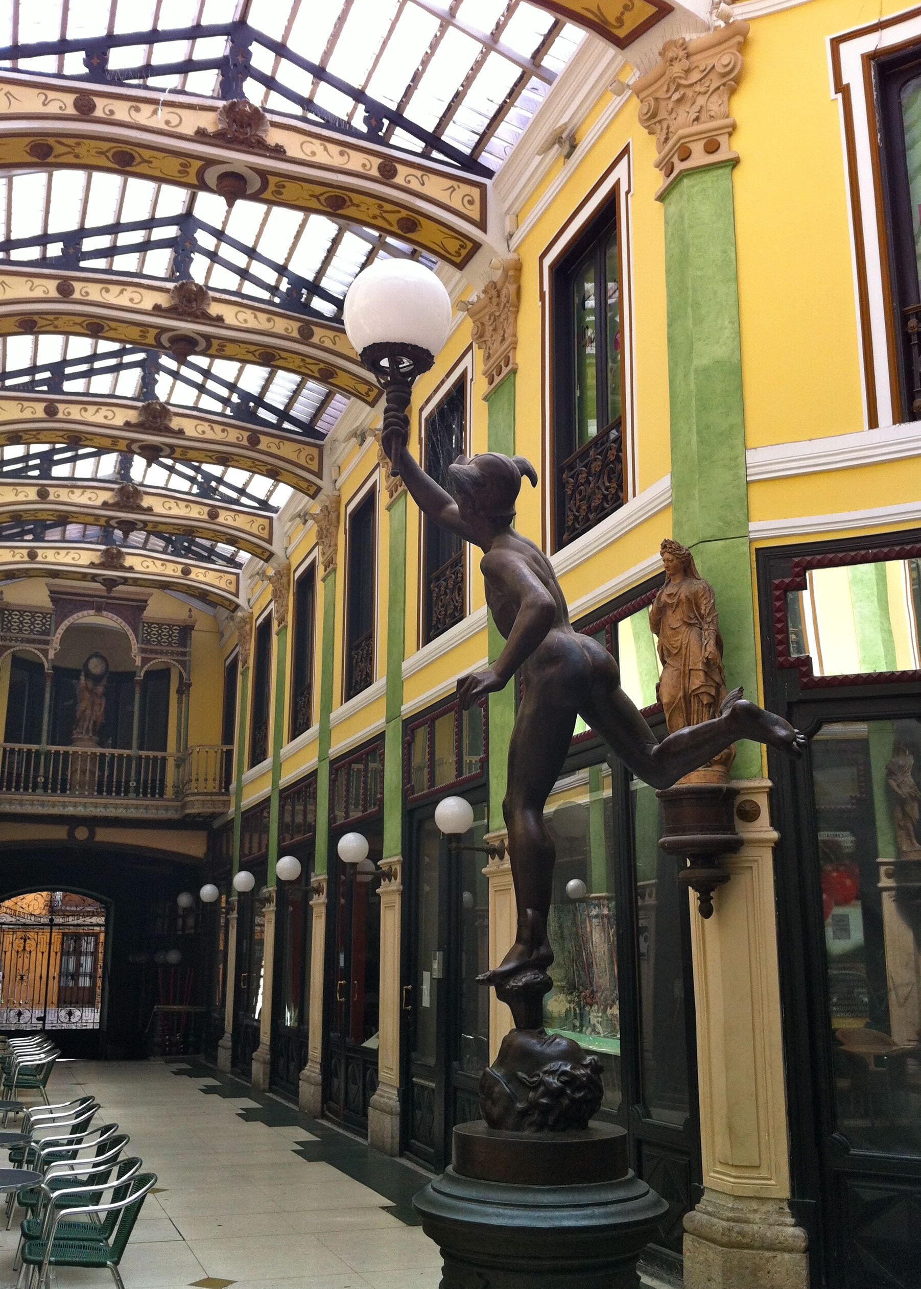 I found a partly abandoned shopping center in Valladolid -called Pasaje de Gutiérrez- where a copy of our Mercury, as god of commerce, keeps his balance with dignity and full of cobwebs. Still in attitude.
