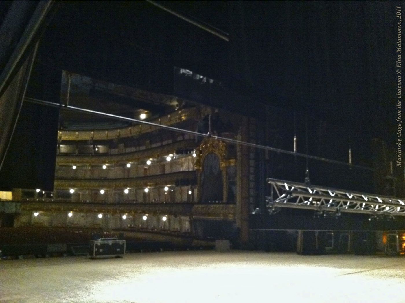 [Chácena: (from catalan jàssena, jácena). f. In some theaters, a large rectangular area at the center of the back wall of the stage and under the girder that supports it. It’s used as a rear access to the stage, a deposit of packages, or an extension of the stage. Diccionario de la Real Academia de la Lengua Española, 22nd ed., 2001]